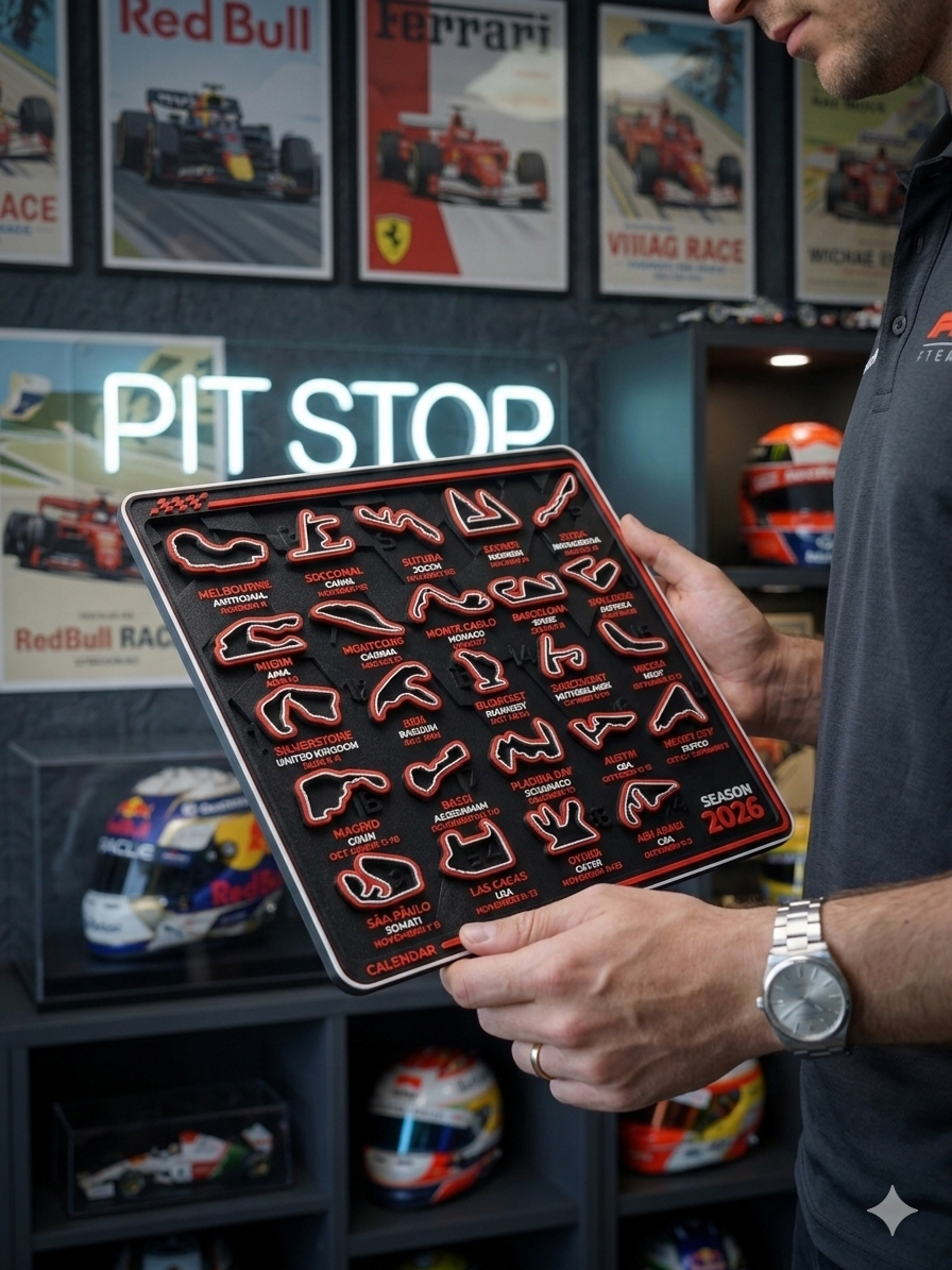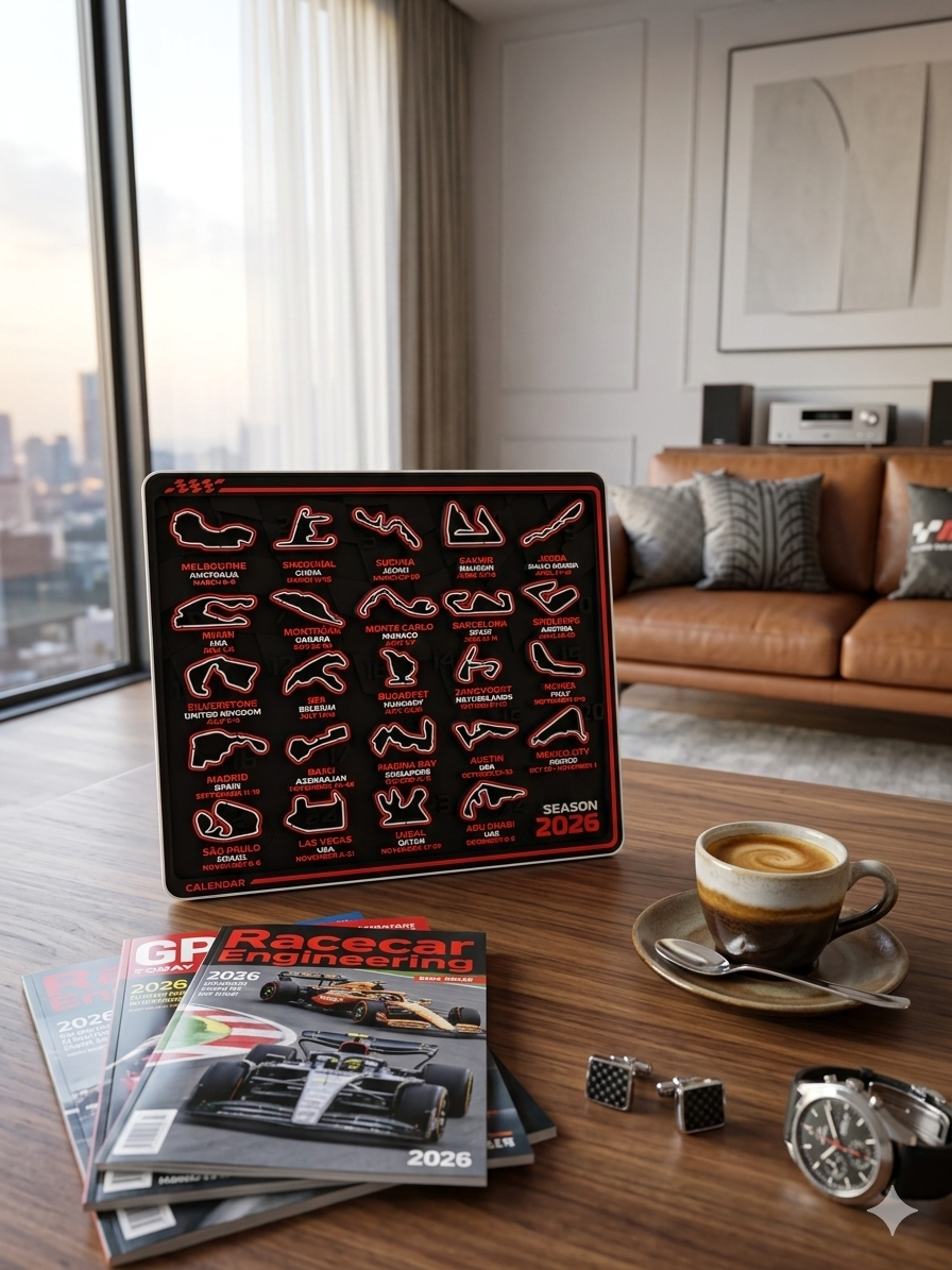 Designed for Formula 1 enthusiasts and modern collectors, this desk collectible features all 2026 race circuits, locations, and dates in a bold, sculptural layout.